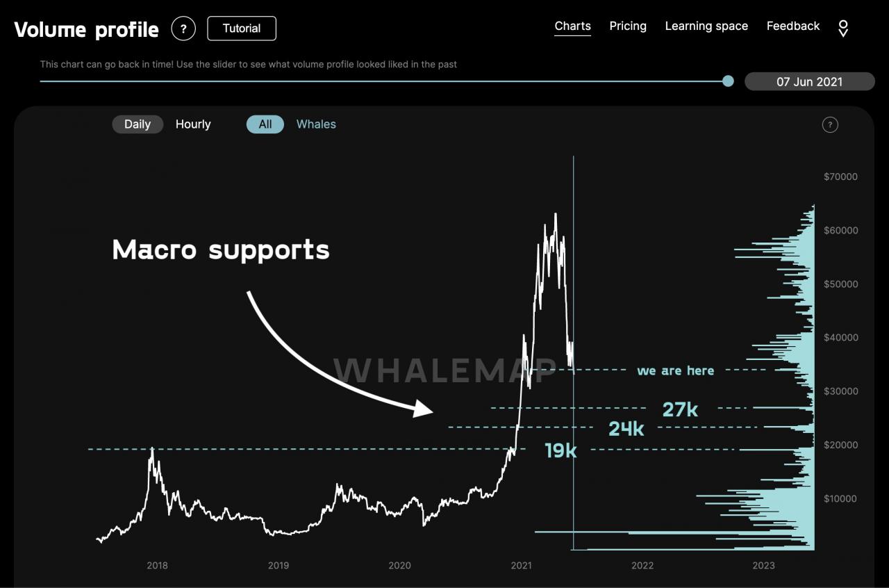 带有支撑位的 Whalemap BTC/USD 交易量K线走势图。 来源:鲸鱼地图/推特