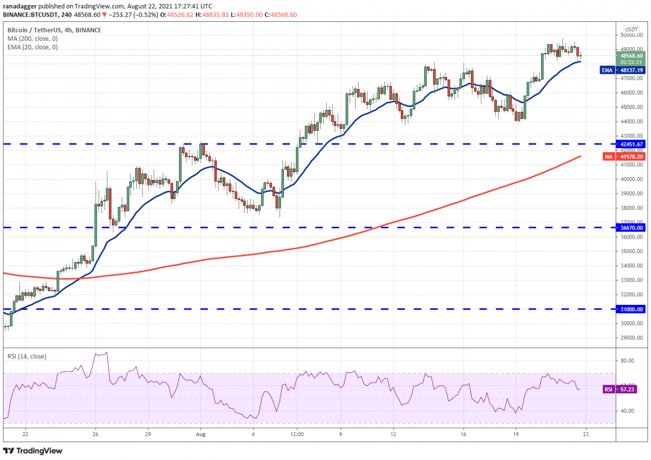 比特币在 8 月 19 日从 20 天指数移动平均线(45,049 美元)反弹,多头在 8 月 20 日将价格推高至上方阻力位 48,144 美元上方。空头目前正试图在心理阻力位阻止上涨50,000 美元。