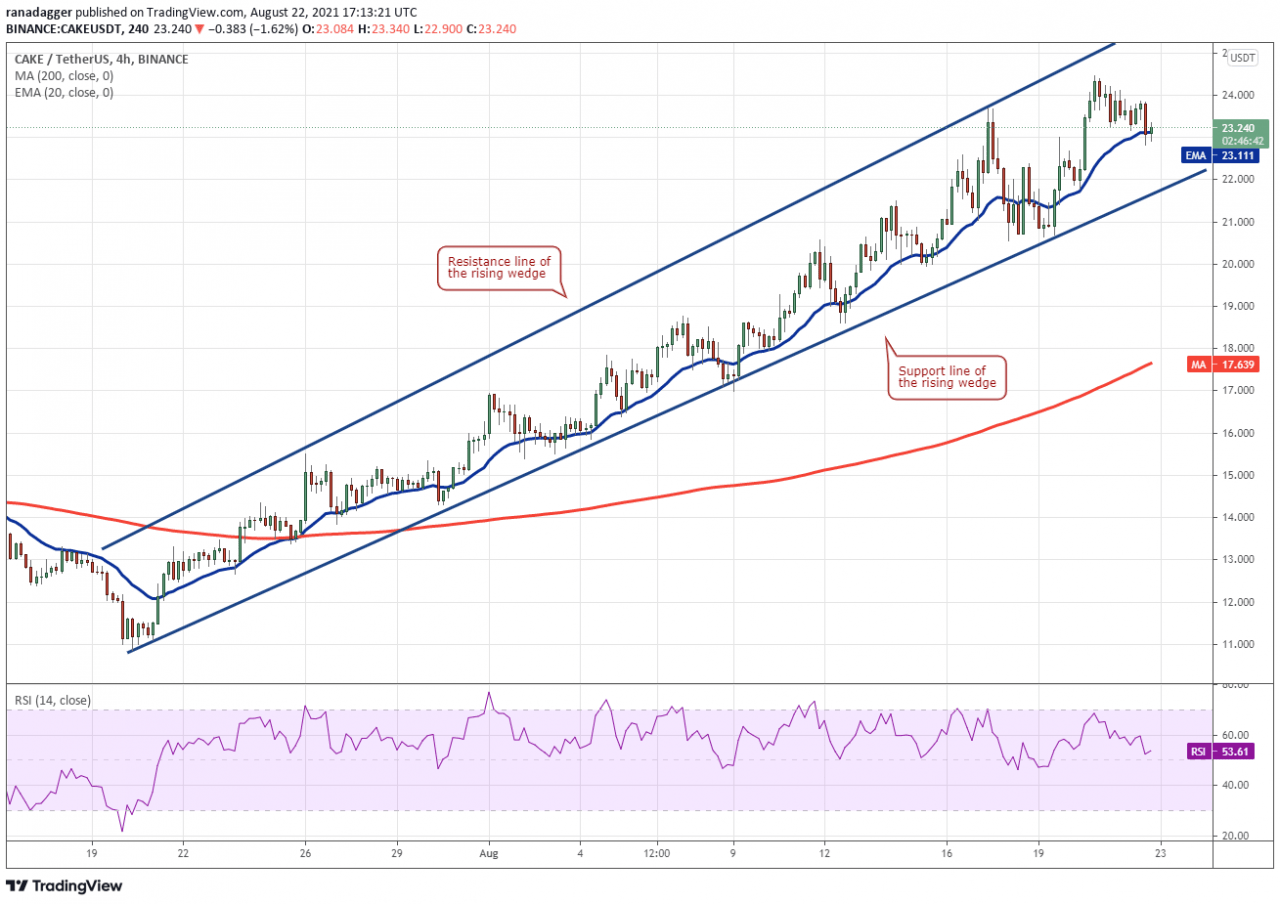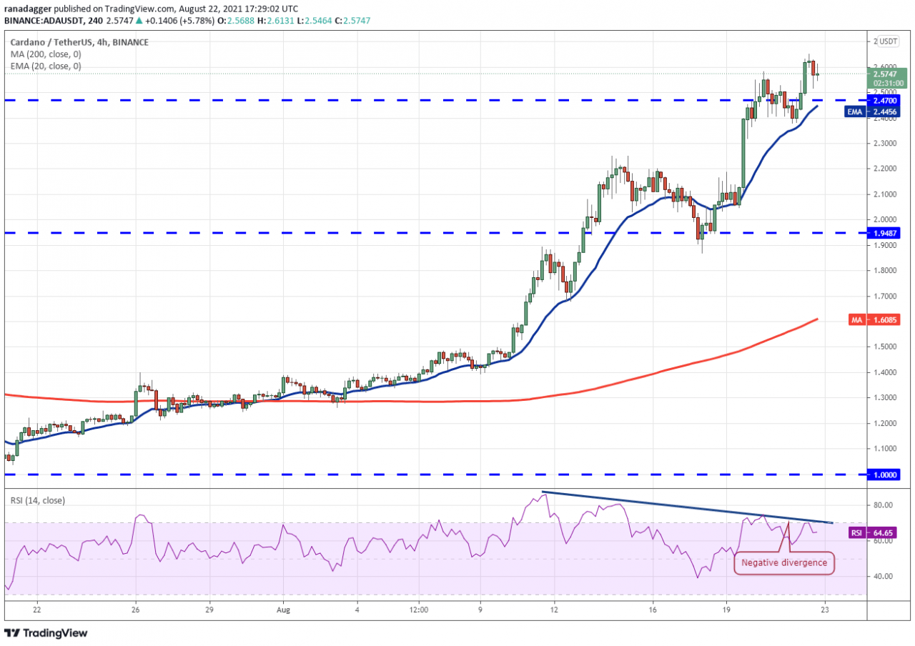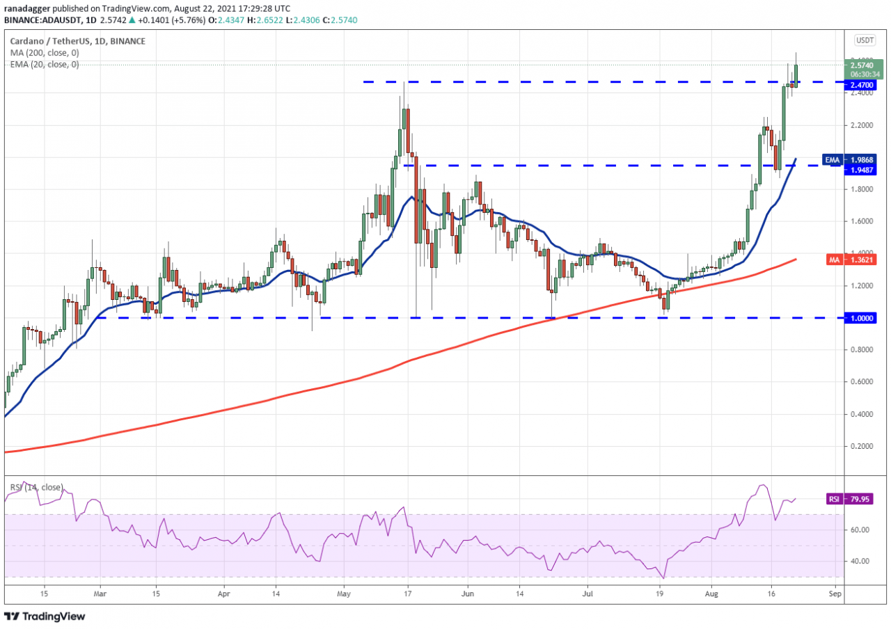 卡尔达诺(ADA)处于强劲的上涨趋势中。 多头在 8 月 20 日将价格推高至历史高点 2.47 美元上方,但当天烛台上的长烛芯显示出在更高水平上的抛售。 山寨币在 8 月 21 日形成了日内烛台模式,表明多头和空头之间犹豫不决。