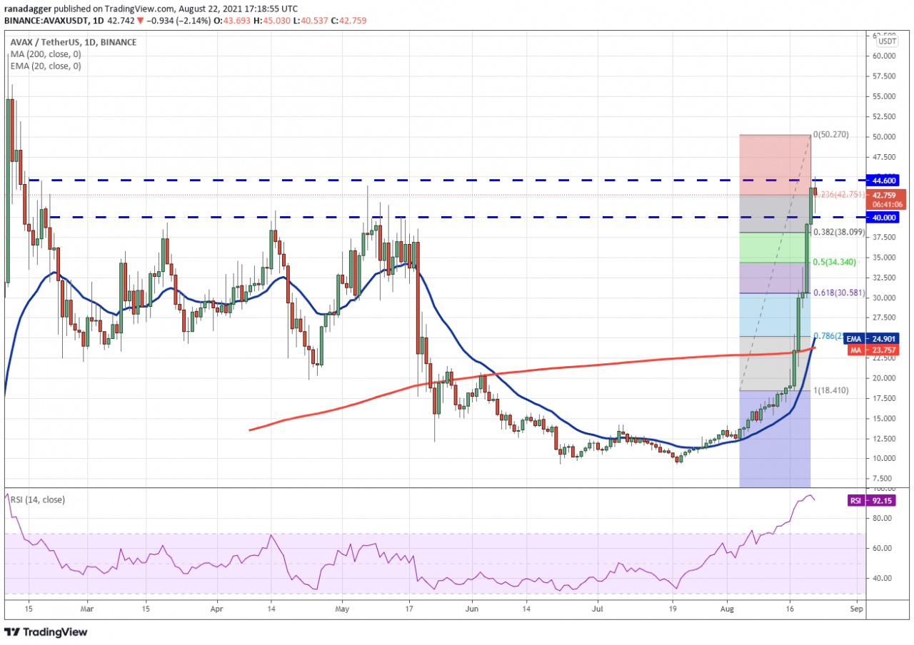 Avalanche (AVAX) 从 8 月 17 日的 18.41 美元上涨至 8 月 21 日的 50.27 美元,短时间内上涨了 173%。 这种大幅上涨已将 RSI 推高至 92 以上,表明短期内涨势过度。