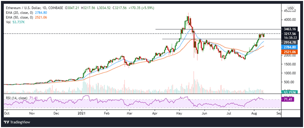 与此同时,在伦敦硬分叉成功实施后,以太坊突破了 3000 美元的关口。 ETH 的价格飙升至 3,265 美元的高位,积极的市场情绪引发了大多数山寨币的类似收益。