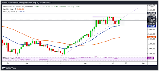如果多头突破上涨趋势线和通道障碍,则直接目标位于 3,350 美元和 3,400 美元以北。 相反,ETH/USD 可能会回撤至 20 EMA(2,978),50MA 提供了大约 2,484 美元的强劲支撑区域。