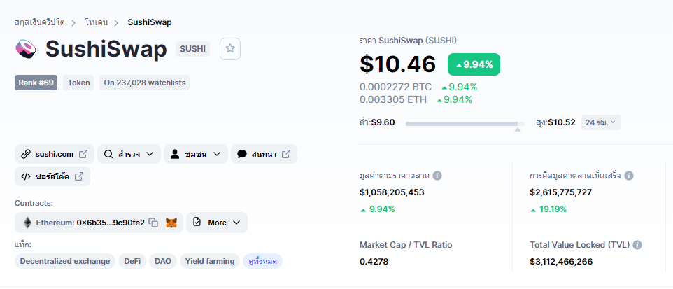 今天,不仅仅是 Uniswap 出现了一些严重的价格飙升。 根据 CoinDesk 的数据,在代币方面,竞争对手的加密货币交易所 SushiSwap 的价值也增长了近 10%,交易价格为 10.46 美元。 Coinmarketcap