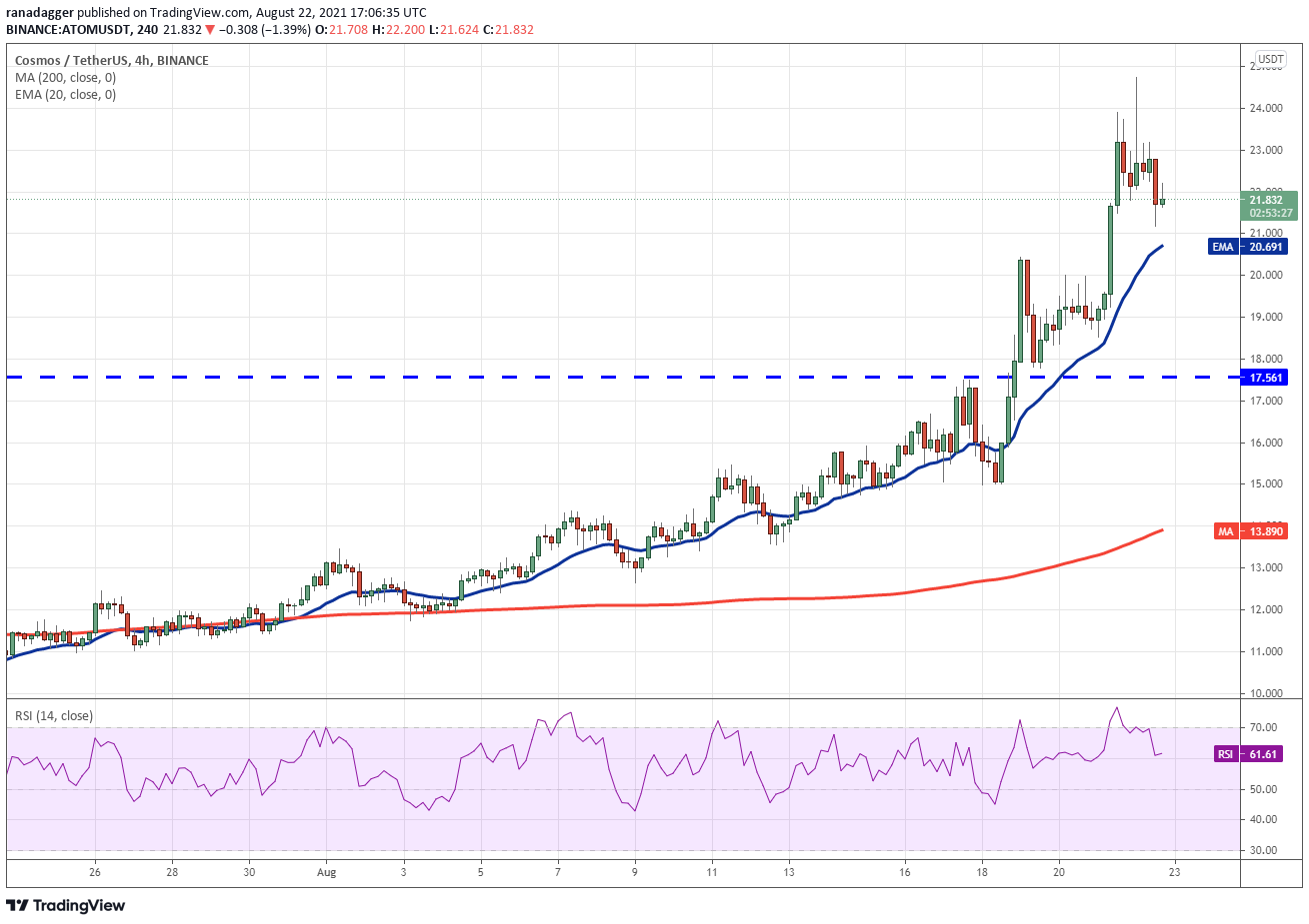 自 5 月底以来,Cosmos (ATOM) 一直在 8.51 美元至 17.56 美元之间的大范围内交易。 多头在 8 月 18 日将价格推高至区间阻力位上方,为可能升至 26.61 美元的模式目标铺平了道路。