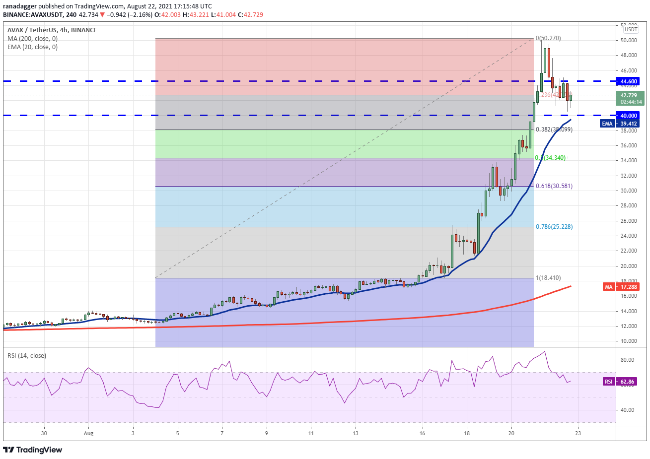 Avalanche (AVAX) 从 8 月 17 日的 18.41 美元上涨至 8 月 21 日的 50.27 美元,短时间内上涨了 173%。 这种大幅上涨已将 RSI 推高至 92 以上,表明短期内涨势过度。