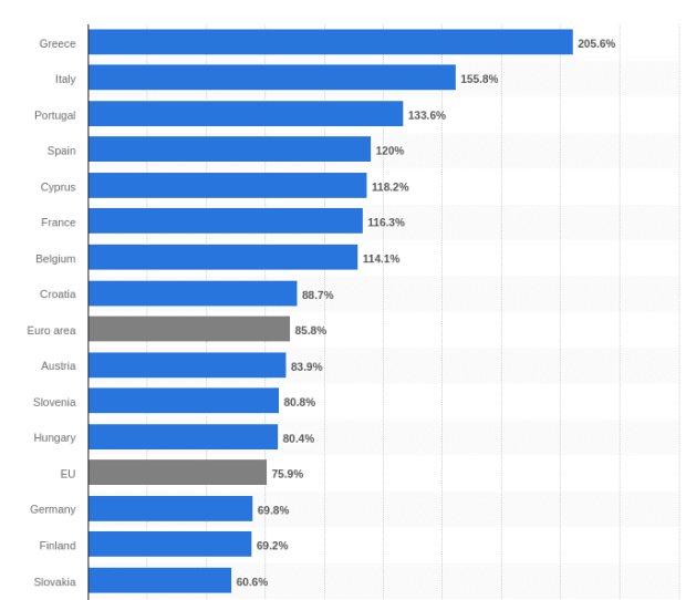 从那时起,整个欧元区一直处于零利率的生活支持状态。 永久宽松的货币政策对成员国的公共财政产生了灾难性的影响。 要最初采用欧元,候选国家必须满足马斯特里赫特标准,其中之一是将公共债务保持在该国国内生产总值的 60% 以下。