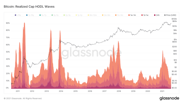第三类是“短期持有者”。 它们按一天到一个月的年龄分组。 这些看起来会在比特币历史上的巨大价格飙升中达到顶峰。 如果仔细观察,你会看到每次牛市的价格都出现了三个大幅上涨。 目前,我们只是在第一次价格飙升。 看起来这可能是零售和短期投机者的到来。