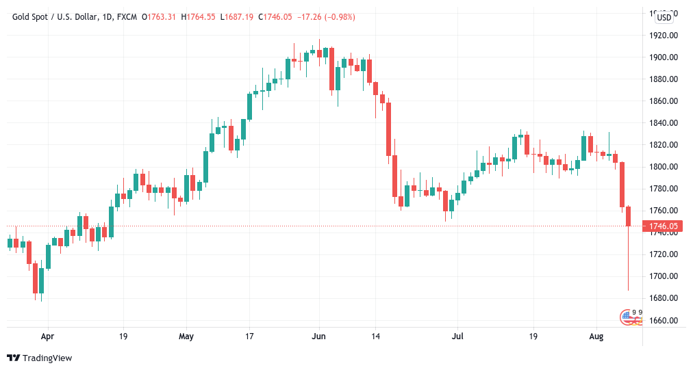 在以 1,763 美元开盘后,金价大幅下跌,甚至一度跌至 1,686 美元,随后回升,利用上周五的跌幅并触及 3 月底以来的最低点。