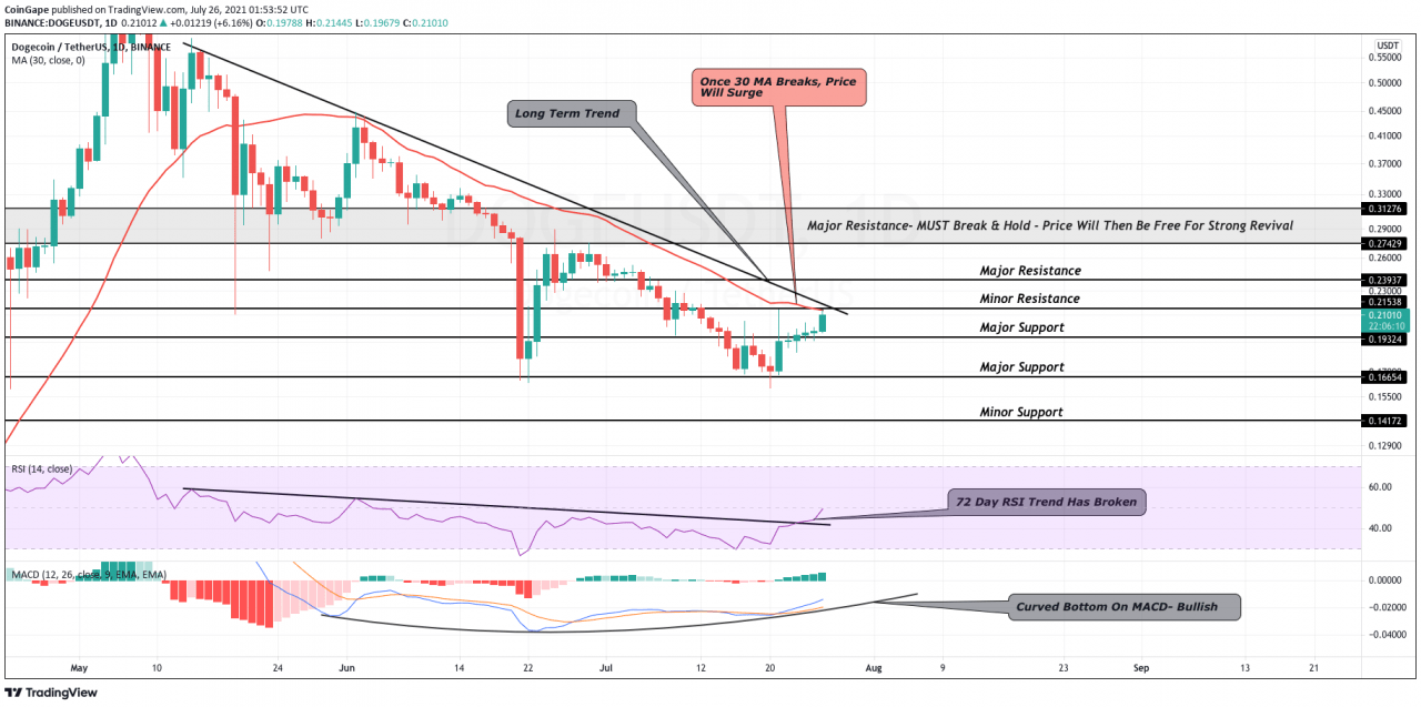 在查看 RSI 时,我们可以看到强度已突破 72 天趋势线。 这是复兴的好兆头,只要实力能冲破50,DOGE一定会很快暴涨。 MACD 已经形成了一个弯曲的底部形态,这是一个非常看涨的信号。