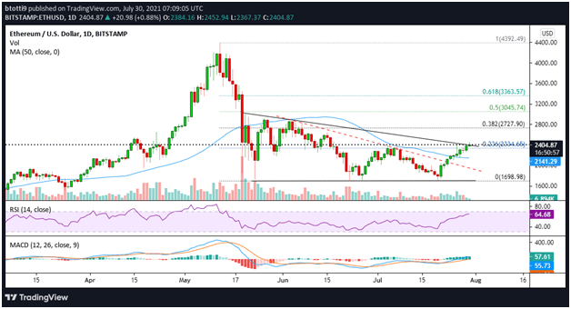 ETH/USD 在日线图上遵循看涨趋势线,目前位于 50 SMA 和从 4,380 美元跌至 1,700 美元的 23.6% 斐波纳契回撤位上方。