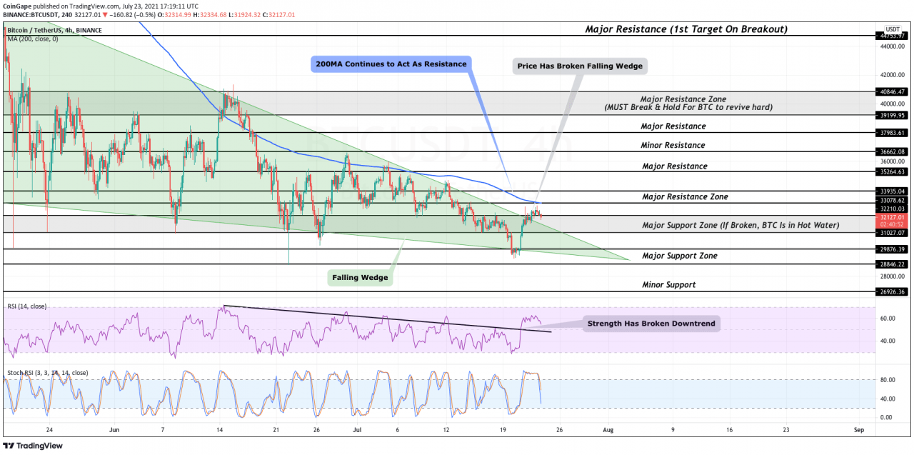 在撰写本文时,BTC 停在其主要阻力位 33,078-33,935 美元。 BTC 价格必须突破并保持这一关口才能大幅反弹至 35,000 美元及以上。 与这个主要阻力区一起是 200MA。 该均线已成为数月的障碍,如果多头未能保持在该标记上方,则 BTC 可能会再次下跌。 任何低于 31,027 美元的价格都会使 BTC 价格重新陷入困境。