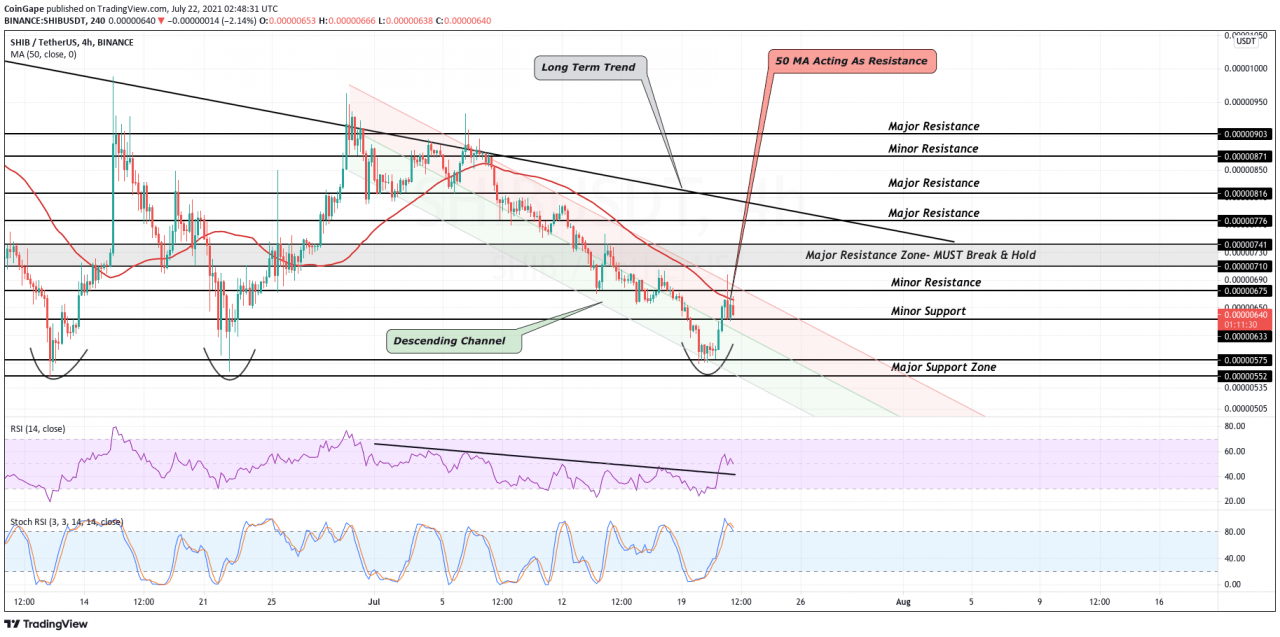 在过去的 3 周中,SHIB 价格已形成下行通道形态。 价格非常尊重通道的两侧,因为 SHIB 今天刚刚经历了顶部趋势线的拒绝。 SHIB 必须与 50 均线一起突破该顶部趋势线,因为它已经将价格压低了两个多星期。 然后,多头将不得不克服 0.00000675 美元的小阻力,才能自由地进行更大的上涨趋势。