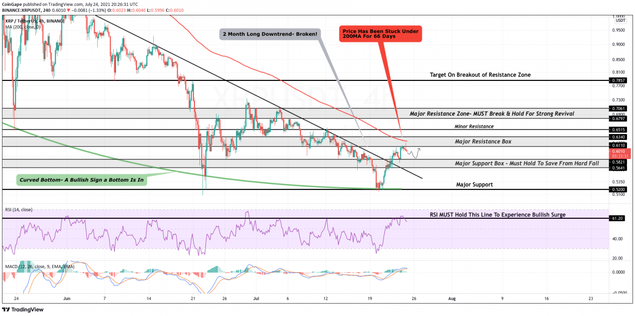 与价格目前停在的阻力盒一起,位于 200 均线。 价格已在此 MA 下方停留 60 多天,一旦清除,XRP 将开始回升至 1.00 美元。 如果空头决定在短期内超越,我们可以预期 XRP 价格将在 0.58 美元获得支撑。 除了这一关口外,还有另一个支撑位 0.56 美元,该价格必须保持在上方才能继续看涨上涨趋势。 低于此框的任何内容都可能导致严重垮台。