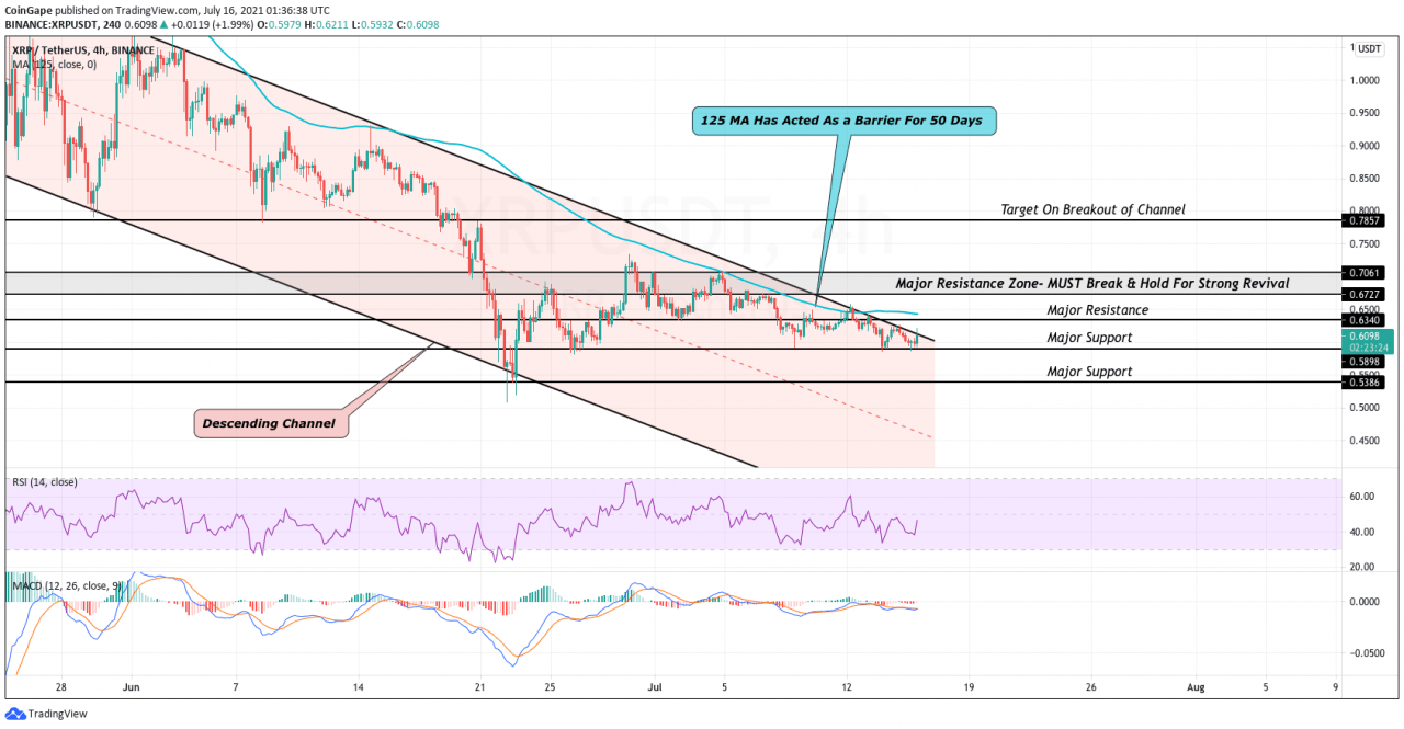 在查看价格K线走势图时,我们可以看到 XRP 价格如何遵循近 2 个月的下跌通道(以红色显示)。 在此期间,价格多次拒绝顶部趋势线,因为多头似乎无法实现突破。 在撰写本文时,XRP 正试图在其下跌通道内突破顶部趋势线。 如果这被认为是成功的,XRP 价格将不得不清除其 125 均线,这已成为近 60 天的障碍。