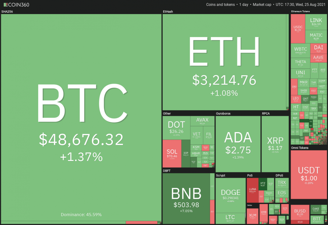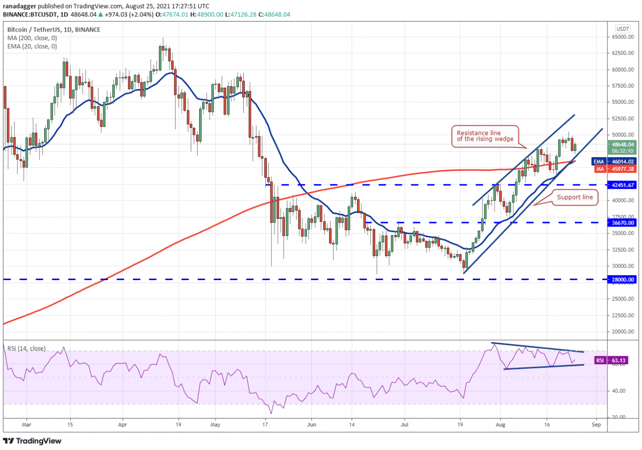 比特币 (BTC) 在 8 月 23 日突破了 50,000 美元的心理关口,但当天烛台上的长灯芯显示出更高水平的获利预订。 抛售在 8 月 24 日和 8 月 25 日继续,这将价格拉低至上涨楔形的支撑线。