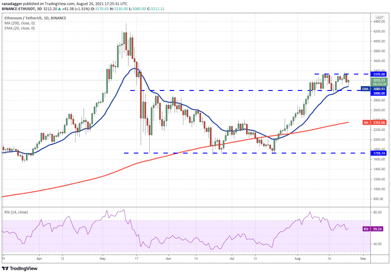 ETH/USDT 对在 8 月 25 日跌至 20 日均线(3,080 美元),但烛台上的长尾显示买盘处于较低水平。 如果价格维持在 20 天均线上方,买家将再次尝试将该货币对推高至 3,335 美元以上。