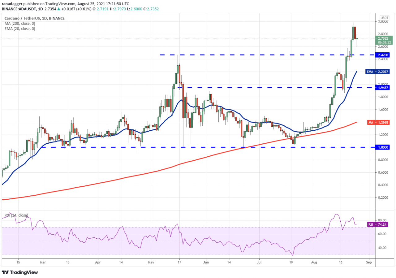 卡尔达诺 (ADA) 在 8 月 24 日在 3 美元的心理价位附近看到了利润预订,但一个积极的迹象是多头并没有放弃太多的立场。 8 月 24 日和 8 月 25 日烛台上的长尾表明在较低水平上增持。