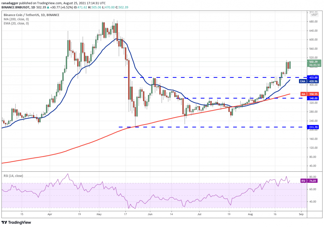 如果多头将价格推高并维持在 509.72 美元上方,则 BNB/USDT 货币对可能会开始向北迈向 600 美元。 上涨的 20 天 EMA(420 美元)和超买区域的 RSI 表明买家占上风。