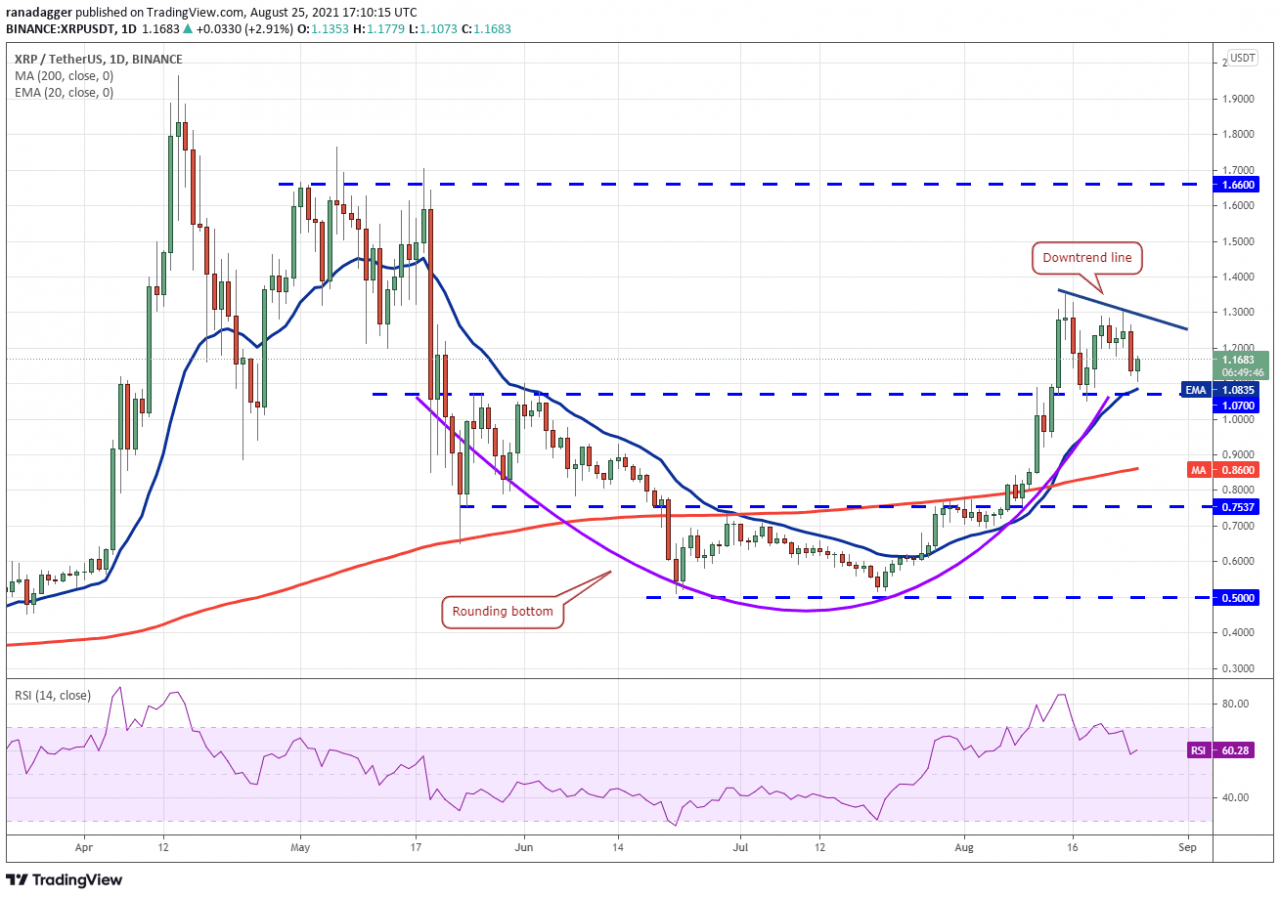 XRP 8 月 23 日烛台上的长灯芯表明,空头正试图在 1.30 美元至 1.35 美元区域阻止复苏。 这可能导致短期交易者获利了结,导致跌至 20 天均线(1.08 美元)。