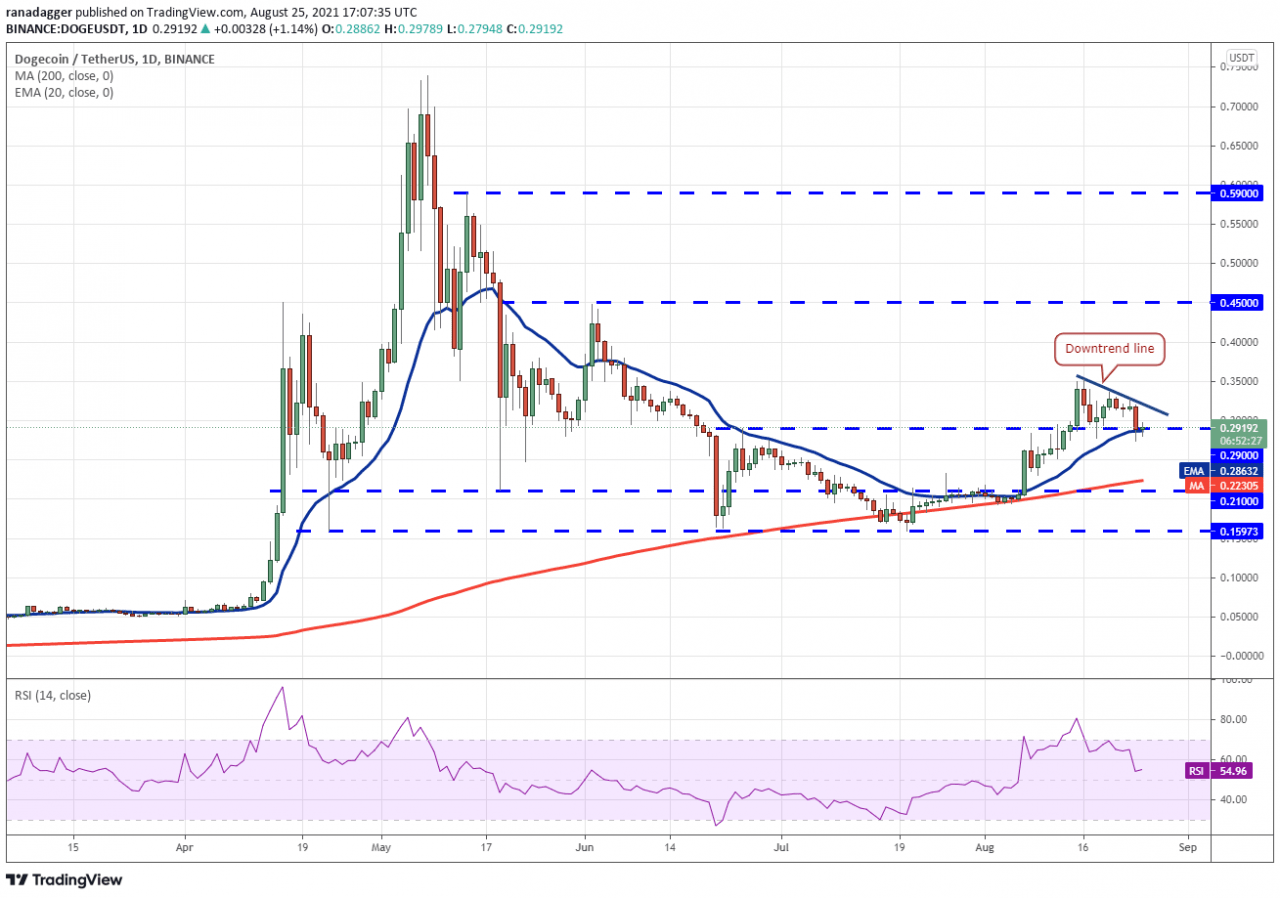 狗狗币(DOGE)从 8 月 24 日的下跌趋势线回落,跌至 20 天均线(0.28 美元)。 尽管多头为支撑位辩护,但未能实现强劲反弹表明缺乏积极的买盘。