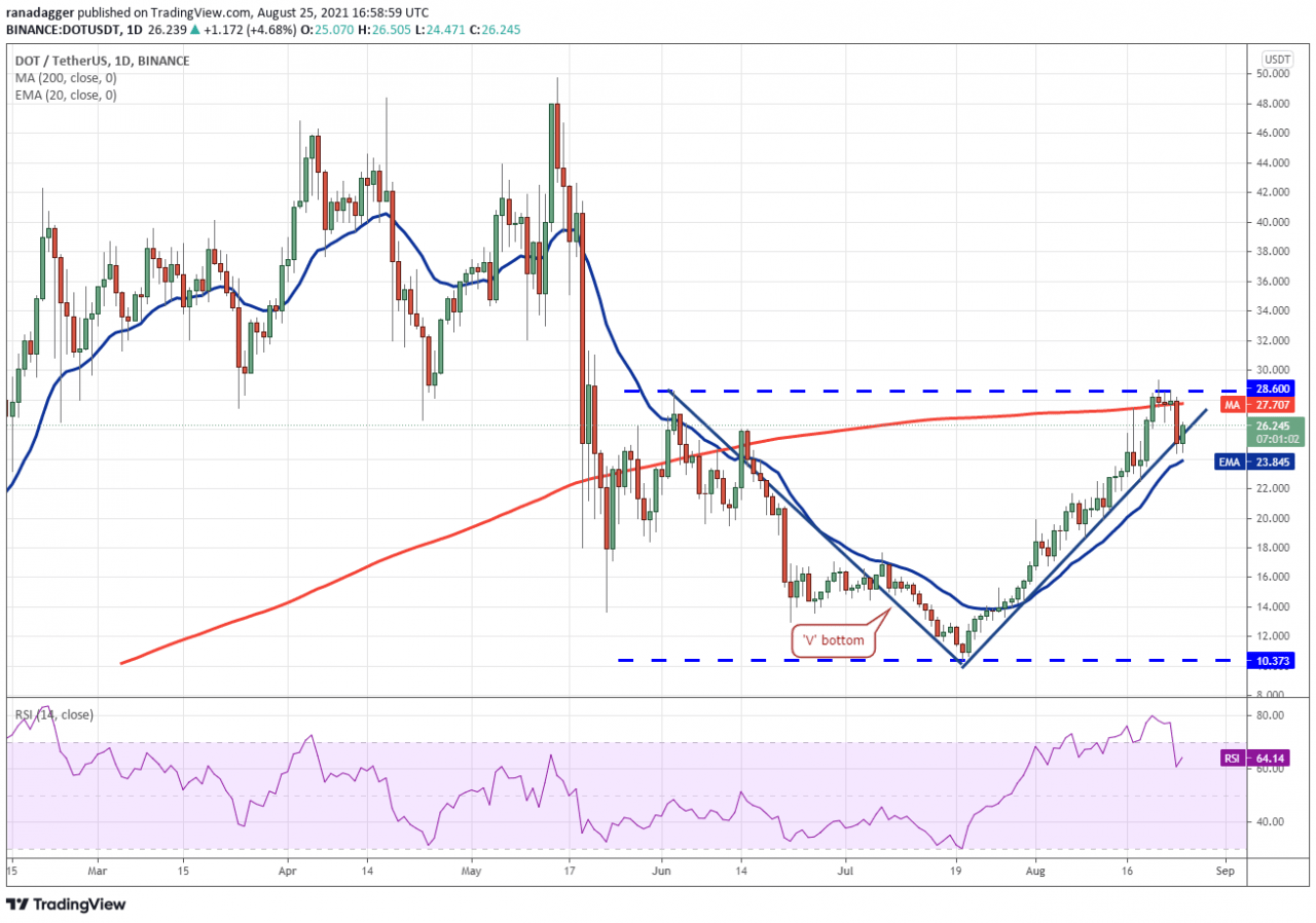 过去几天多头未能将 Polkadot (DOT) 推高至上方阻力位 28.60 美元,这在 8 月 24 日吸引了获利了结。价格跌至 20 日均线(23.84 美元)附近,但买家正在尝试绑定。