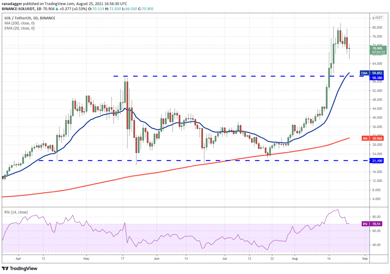 如果空头将价格跌破 20 天均线,则 DOGE/USDT 对可能跌至 0.21 美元的下一个支撑位。 这样的举动将表明最近突破 0.29 美元是一个牛市陷阱。 然后该货币对可能会在几天内保持在 0.21 美元至 0.29 美元之间的区间波动。