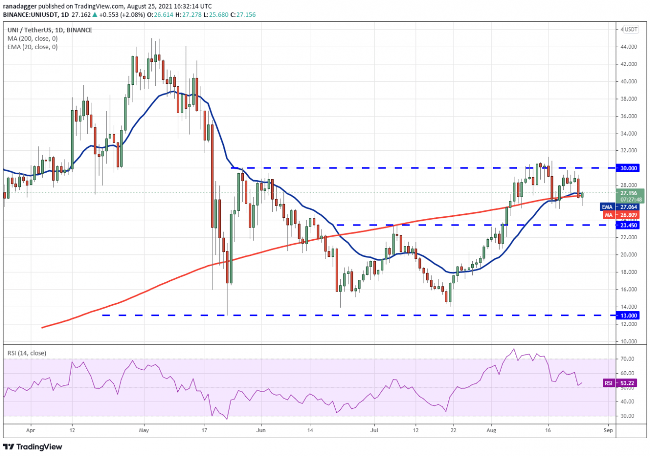 如果多头未能将价格维持在移动平均线上方,则 UNI/USDT 货币对可能跌至 23.45 美元。 从该水平强劲反弹将表明交易者逢低买入。 这可能会使该货币对在接下来的几天内保持在 23.45 美元至 30 美元之间。