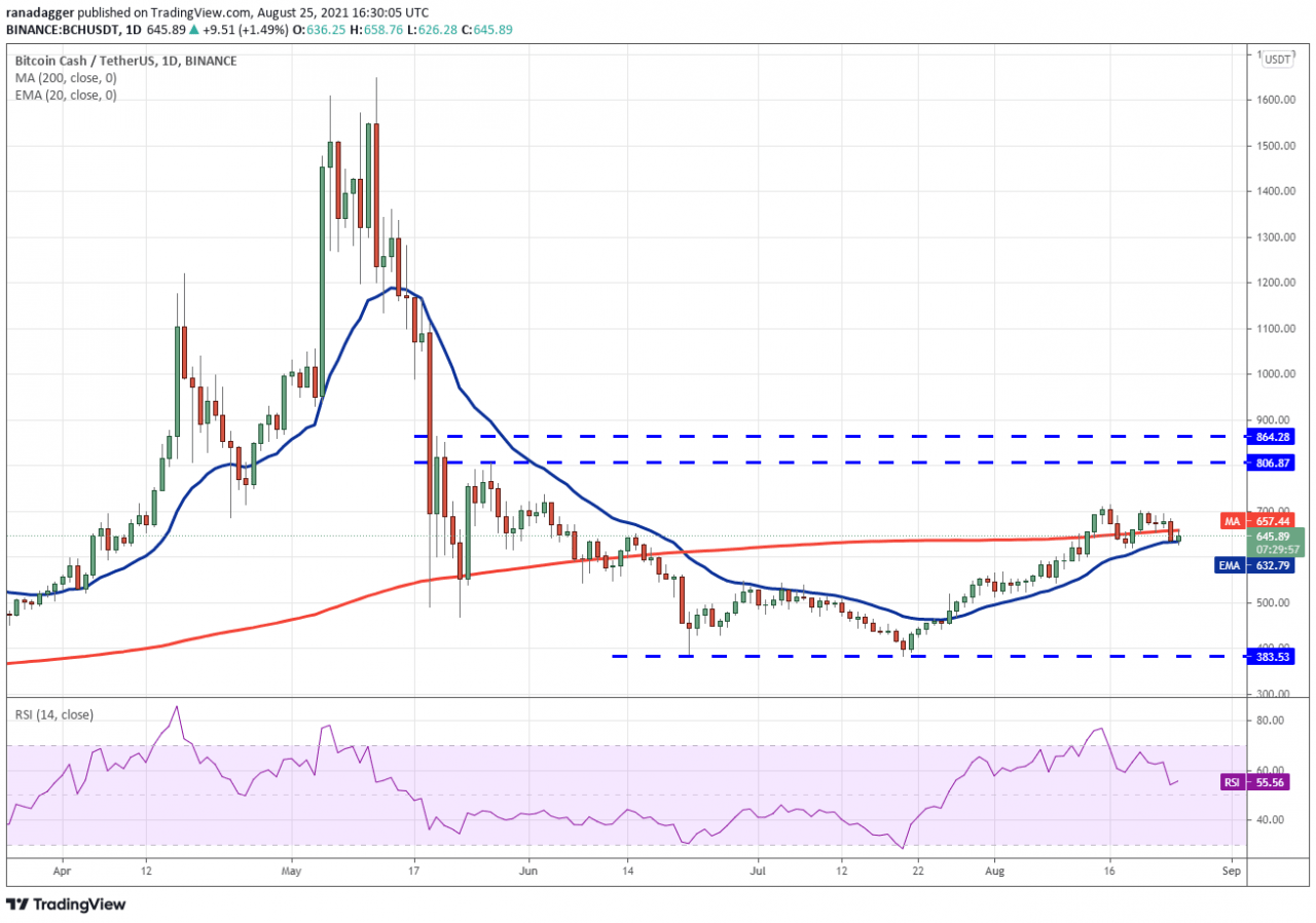 比特币现金(BCH)在 8 月 24 日从 700 美元跌至 714.76 美元上方阻力位并跌破 200 日均线(657 美元)。多头目前正试图捍卫 20 日均线(632 美元),这是利好标志。