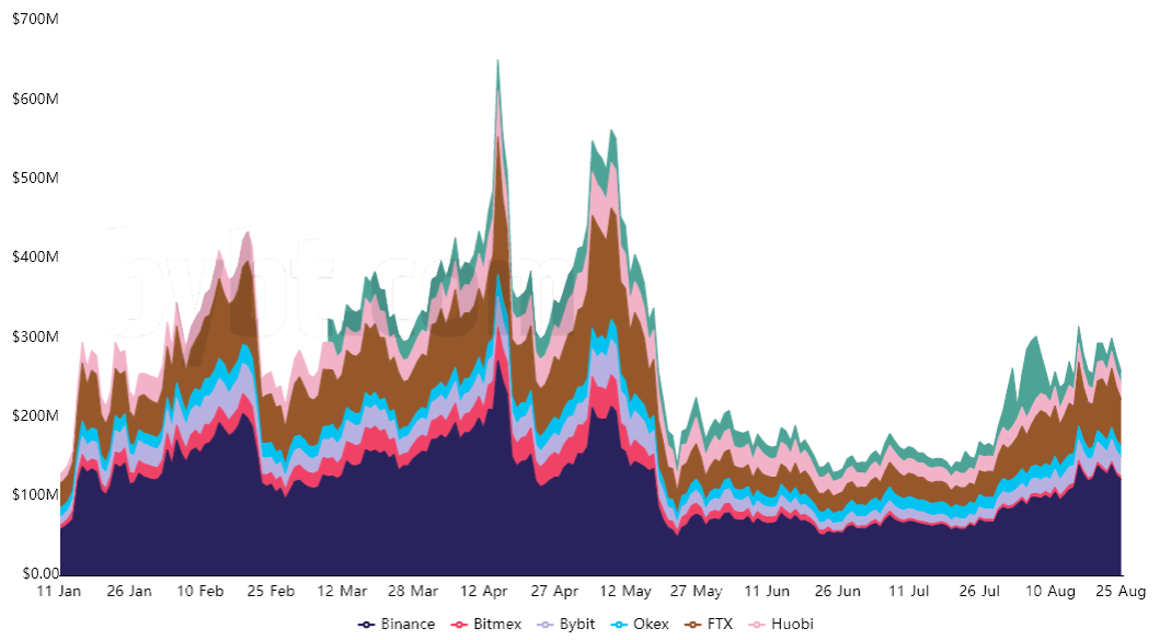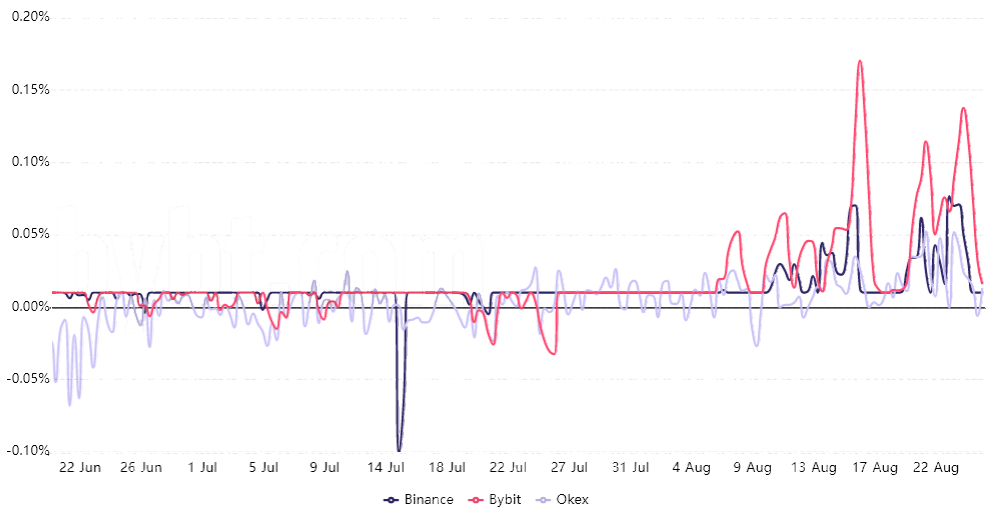 如上图所示,8 月 20 日至 8 月 24 日期间,8 小时的费用平均达到 0.07%,相当于每月 6.2%。 随着 LINK 价格跌破 27 美元,这一瞬间飙升迅速被抓住,并表明多头和空头使用的杠杆之间的平衡状况良好。