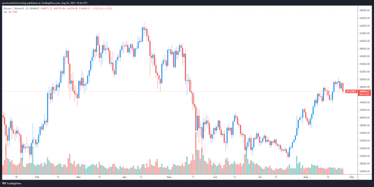 8 月 26 日,由于多头试图将比特币价格推高至 50,000 美元的企图被彻底拒绝,过去几周整个加密货币生态系统的欣喜若狂。