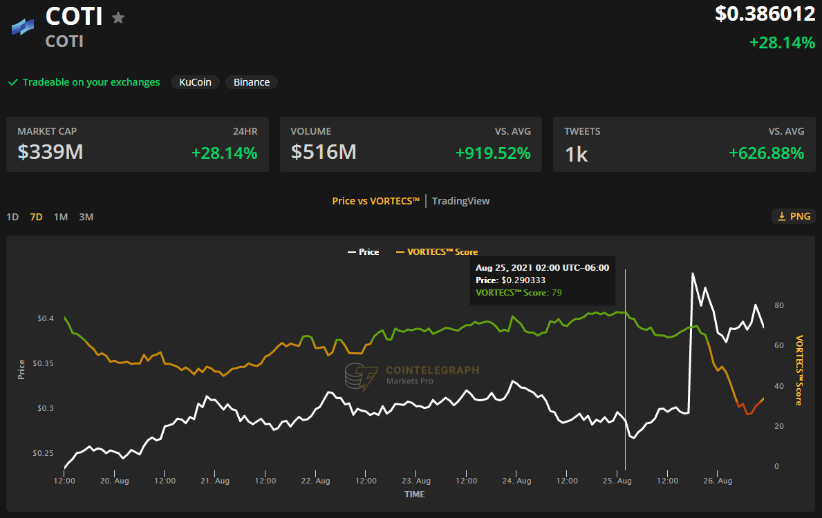 来自 Cointelegraph Markets Pro 的 VORTECS™ 数据于 8 月 22 日开始检测到 COTI 的看涨前景,这是在最近的价格上涨之前。