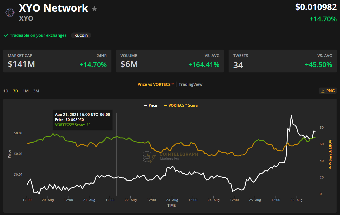 如上图所示,XYO 的 VORTECS™ 评分在 8 月 21 日攀升至绿色区域并达到 72 的高位,大约在其价格在接下来的两天内上涨 36% 之前的 67 小时。