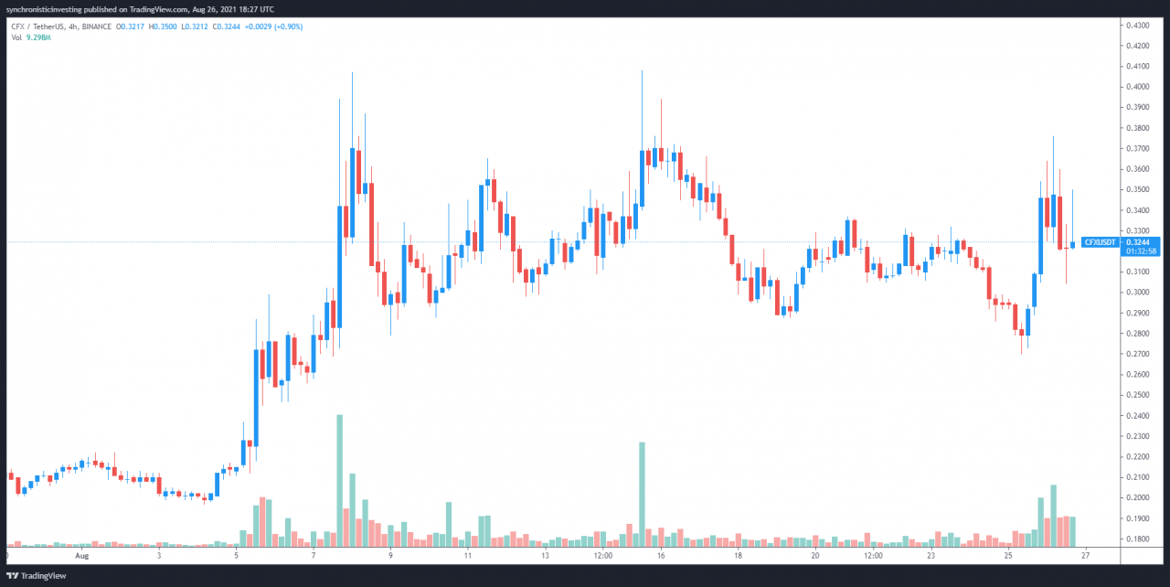 Cointelegraph Markets Pro 和 TradingView 的数据显示,在 8 月 25 日触及 0.269 美元的低点后,CFX 的价格在 8 月 26 日上涨 40% 至盘中高点 0.377 美元,其 24 小时交易量飙升 242% 至 66 美元百万。