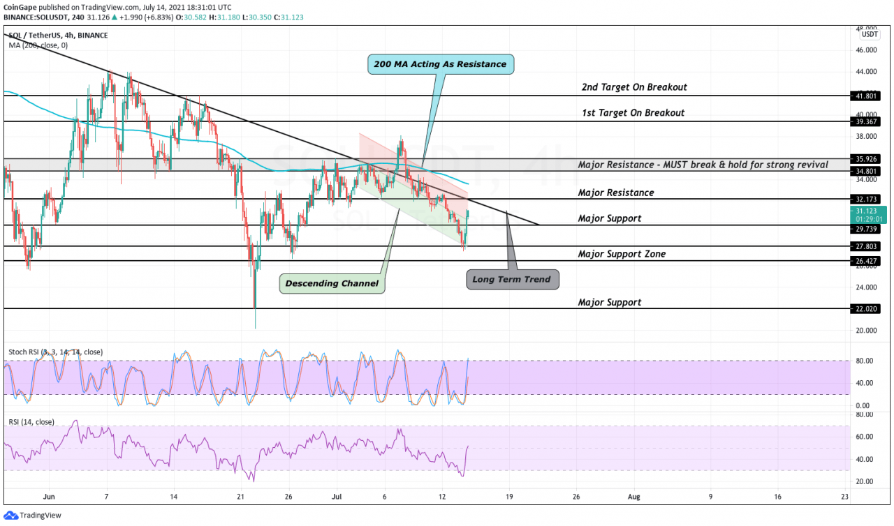 要使 SOL 价格开始强劲复苏,它必须首先突破这条重要的趋势线。 如果这成功,SOL 将不得不与 34.80-35.92 美元的主要阻力区作斗争。