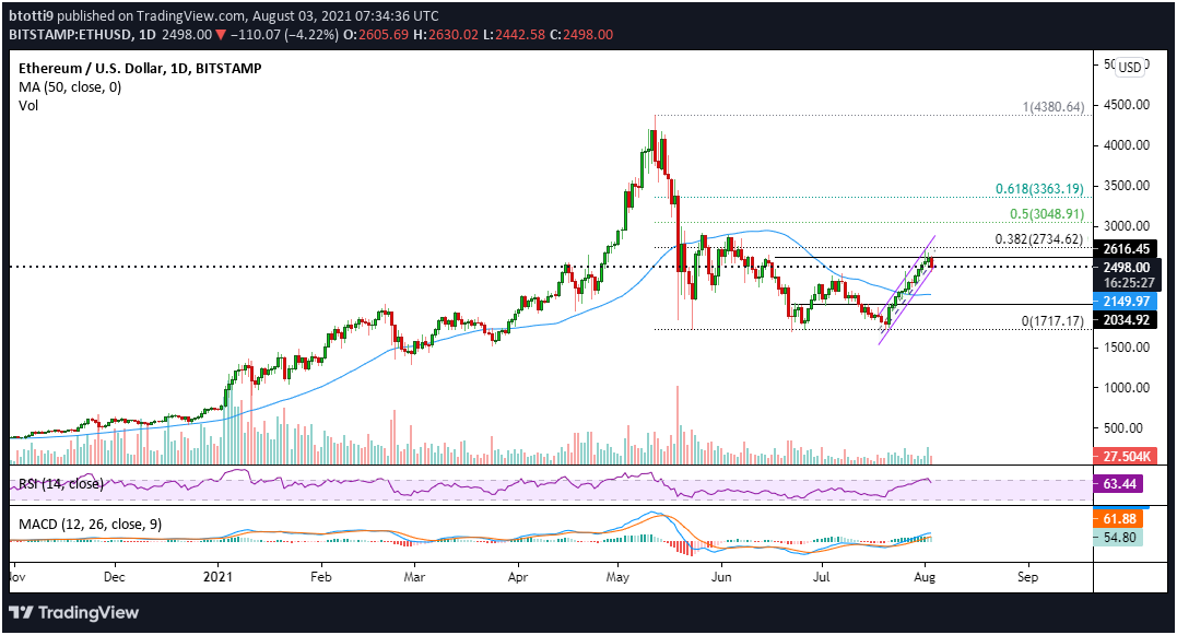 鉴于分析平台 Santiment 的社交对话增加,ETH/USD 货币对似乎将进一步下跌 它说(复制链接打开:https://twitter.com/santimentfeed/status/1422346031707037711) 这可能预示着潜在的价格变化。 在以太坊的 EIP 1559 之前,技术分析师 Michaël van de Poppe 他想(复制链接打开:https://twitter.com/CryptoMichNL/status/1422465940046950404) 跌破 2,540 美元后,ETH/USD 货币对可能跌至 2,180 美元的低点。