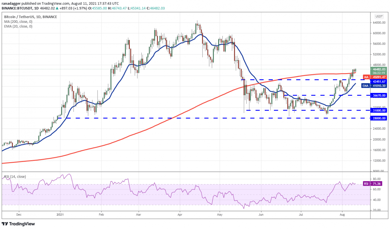 比特币和大多数主要山寨币仍高于各自的 200 天移动平均线,但市场动能将取决于 BTC 能否突破 48,000 美元的水平。