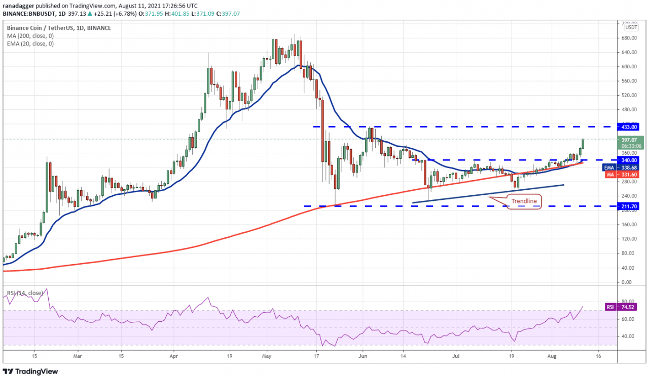 币安币(BNB)于 8 月 9 日从移动平均线反弹,并开始向 211.70 美元至 433 美元的大阻力位上行。 空头可能会积极捍卫 433 美元的水平。