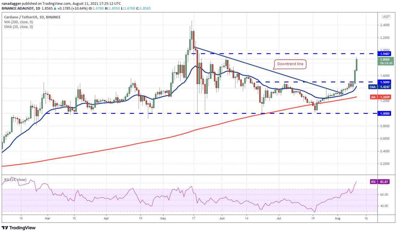 ADA/USDT 对在 8 月 10 日飙升至 1.50 美元上方,现在可能反弹至上方阻力位 1.94 美元。 这个水平可能会吸引利润预订,如果价格从它下跌,空头将试图将价格拉回 1.50 美元。
