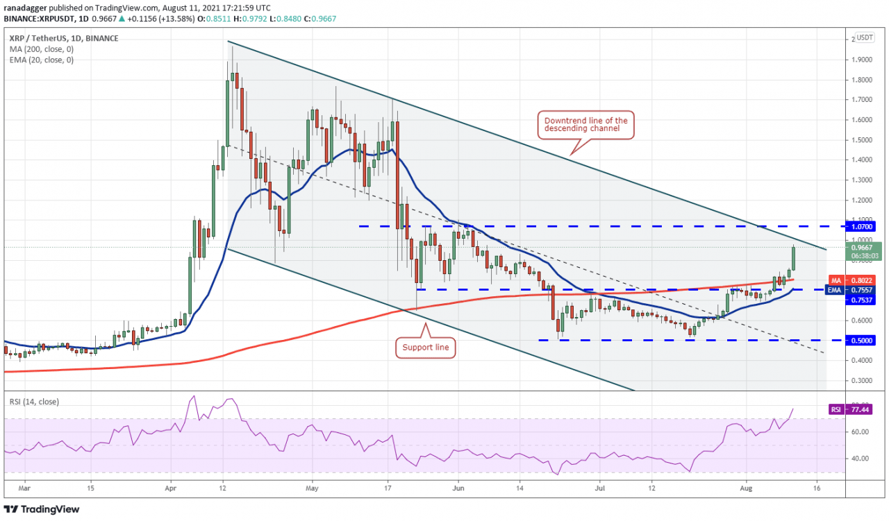 多头在 8 月 9 日成功将突破水平的重新测试保持在 0.75 美元,并将 XRP 推回到 200 日均线(0.80 美元)上方。 山寨币现在可以反弹至下跌通道的下跌趋势线,空头可能会在此形成强阻力。
