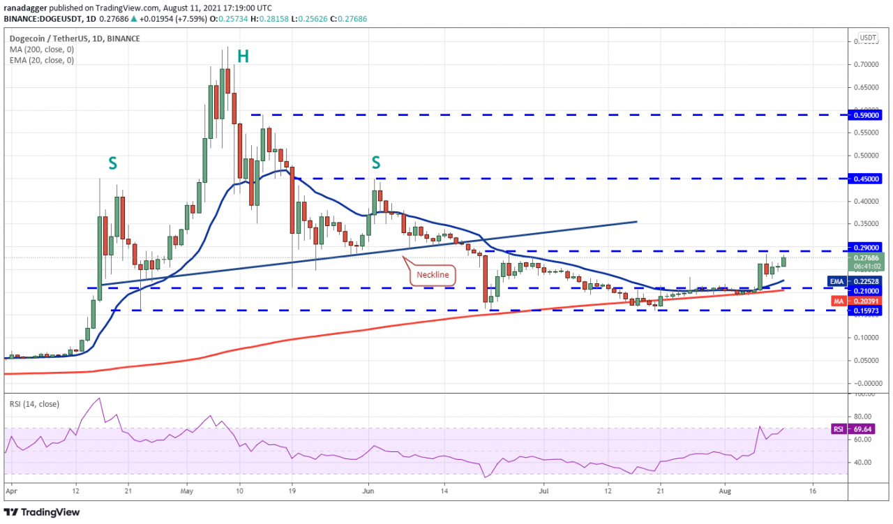 另一方面,如果价格从 0.29 美元下跌,则该货币对可能会跌至 20 天均线。 如果价格从该支撑位反弹,多头将再次尝试将价格推高至 0.29 美元以上。 相反,跌破 20 天均线可能会使该货币对在 0.21 美元至 0.29 美元之间保持几天的区间波动。