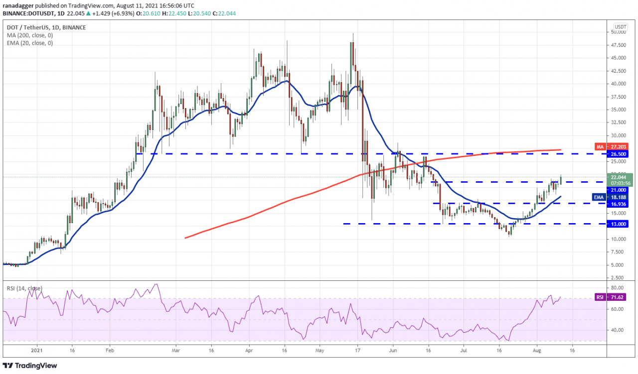 上涨的 20 天 EMA(18.18 美元)和超买区域的 RSI 表明多头处于控制之中。 如果买家将价格维持在 21 美元以上,则 DOT/USDT 货币对可能会开始通往上方阻力位 26.50 美元的旅程。