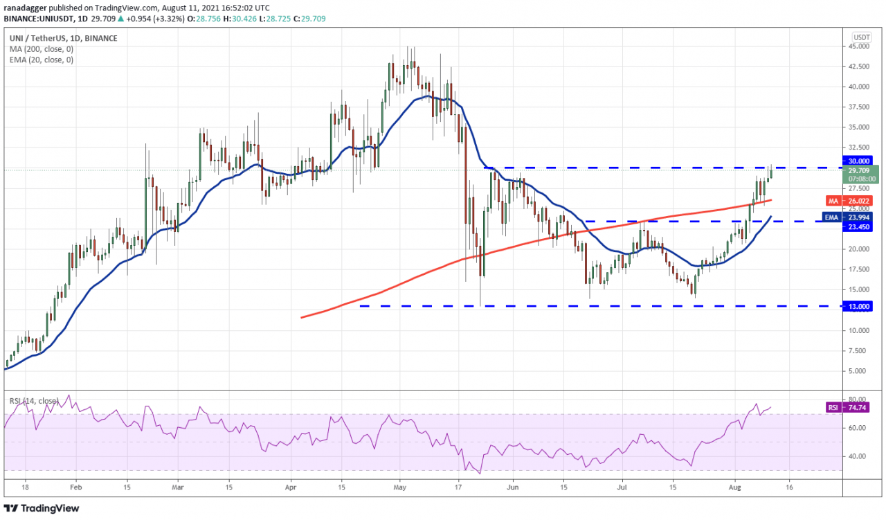 Uniswap (UNI) 在 8 月 10 日从上方阻力位 30 美元回落,但空头未能维持较低水平。 这表明多头在每次小幅下跌时都在买入。