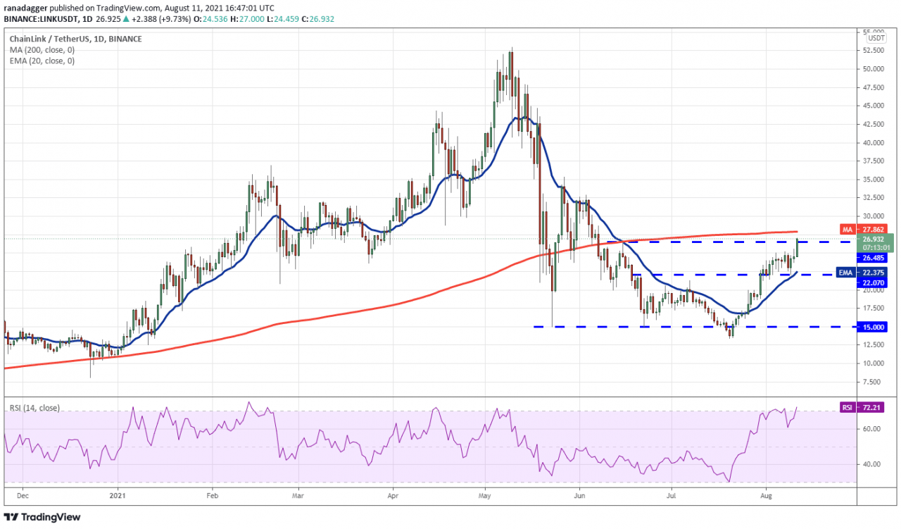 如果价格从该区域下跌,LINK/USDT 货币对可能会再次跌至 20 天均线(22.37 美元)。 从该支撑位强劲反弹将表明市场情绪已转为积极,然后多头将再次尝试清除上方障碍。