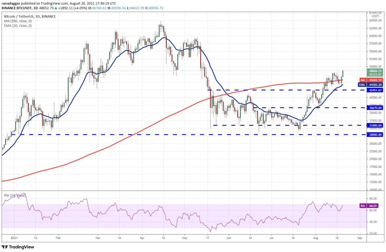 如果买家将价格维持在 48,144 美元以上,那么 BTC/USDT 货币对可能会获得动力并反弹至 51,500 美元,空头可能会再次形成强劲阻力。 如果多头能够在 200 日均线上方阻止随后的下跌,则将表明强势并增加上涨趋势延续的前景。
