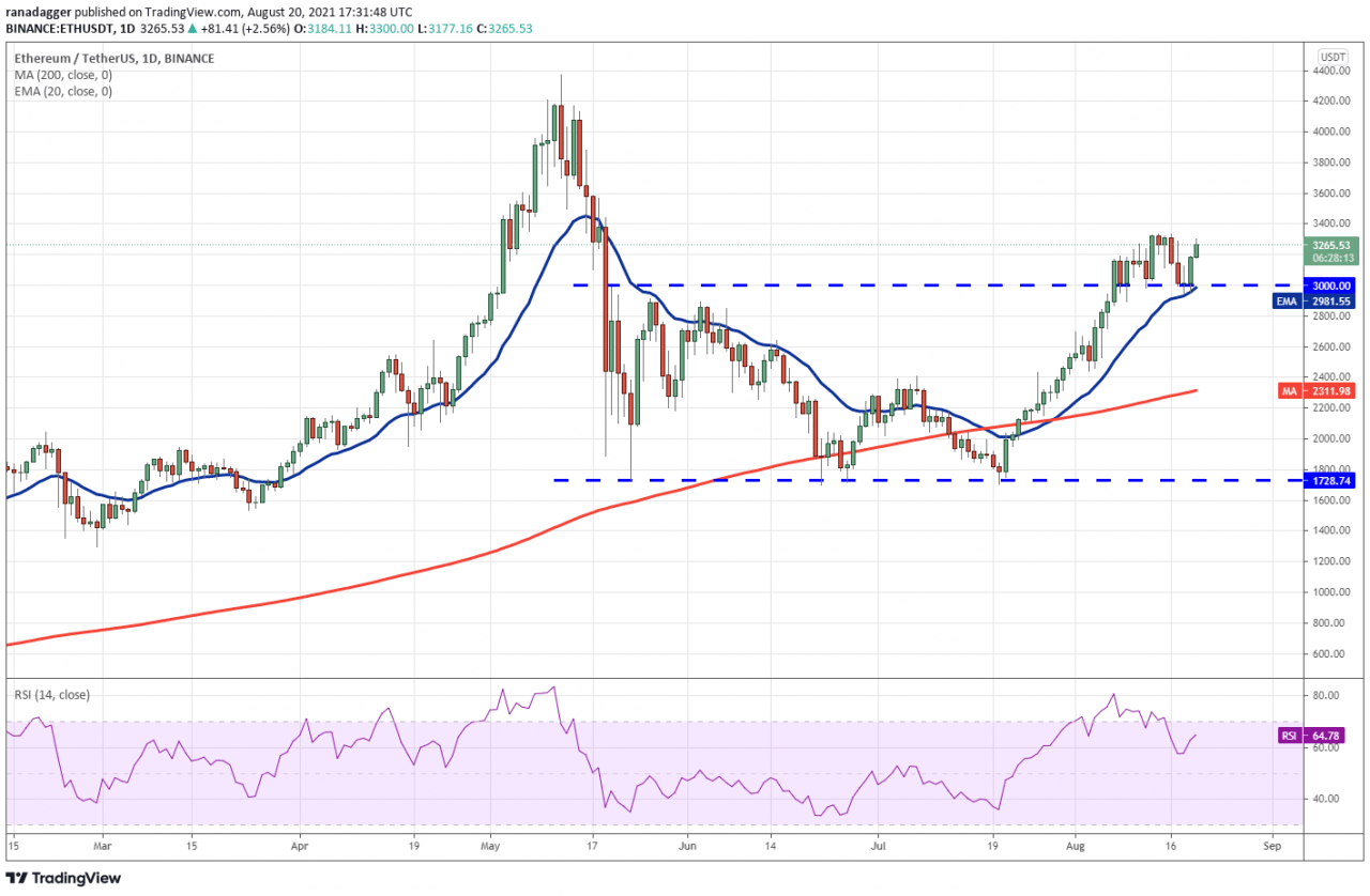 ETH/USDT 对在 8 月 19 日从 20 日均线(2,981 美元)反弹,表明多头正在积极捍卫这一支撑。 买家现在将尝试将价格推高至上方阻力位 3,335 美元。 如果他们设法做到这一点,这对夫妇可能会开始向 4,000 美元迈进。