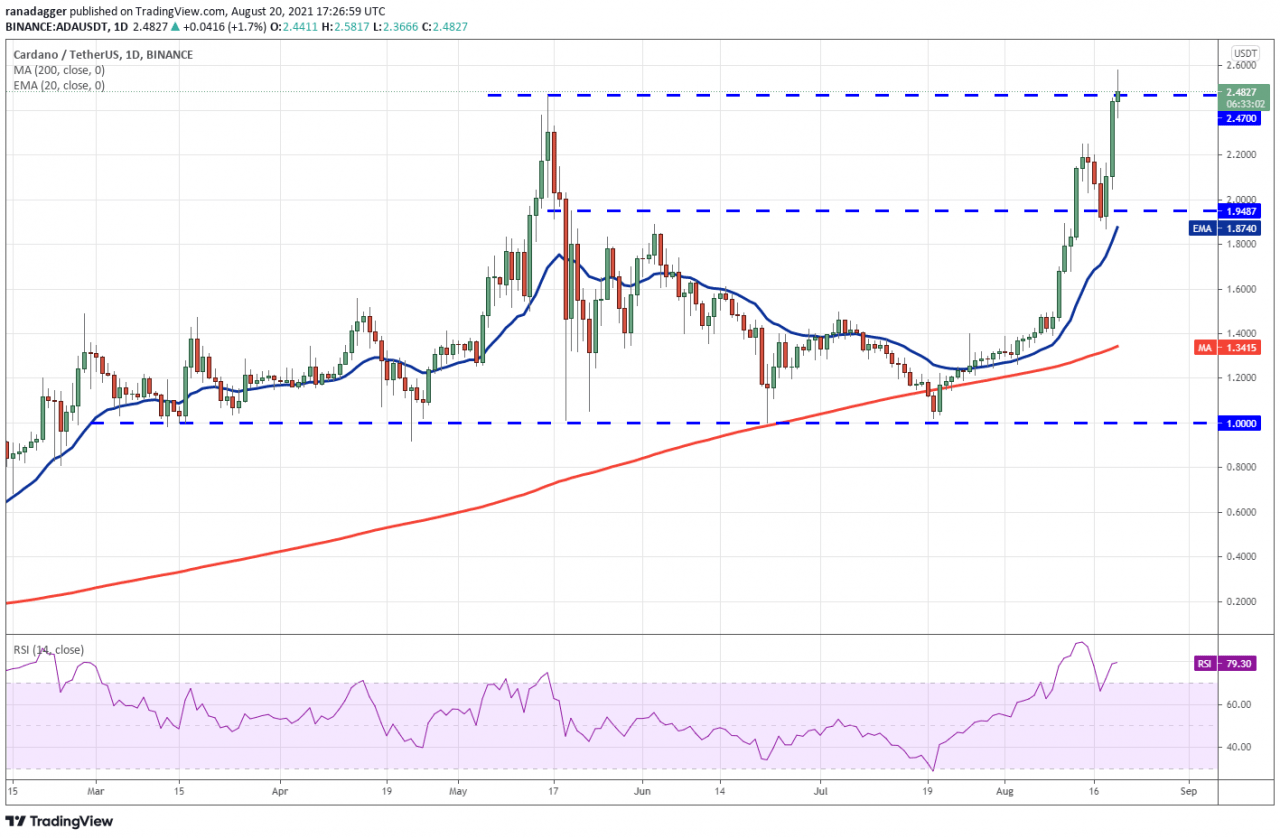 多头在 8 月 17 日和 18 日突破了 1.94 美元的支撑位。这吸引了进一步的买盘,多头将卡尔达诺 (ADA) 推高至今天的历史高点 2.47 美元上方。