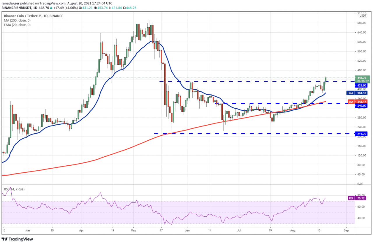 20 天均线的强劲反弹已将价格推高至 433 美元的强阻力位上方。 如果多头将价格维持在 433 美元以上,则 BNB/USDT 货币对可能会开始向北进军,向 520 美元迈进,然后升至 600 美元。