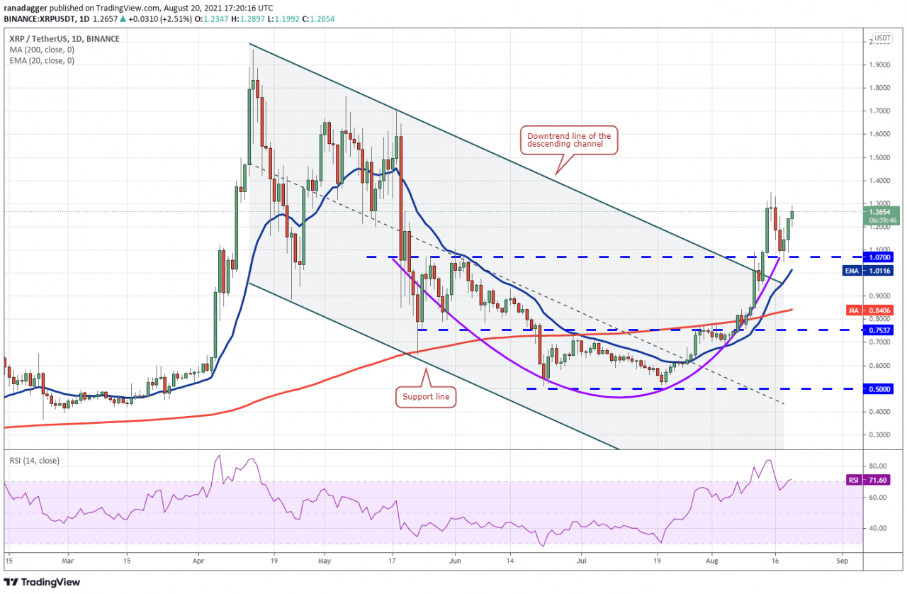 8 月 18 日从 1.07 美元的强劲反弹表明多头成功将这一水平转变为支撑位。 XRP / USDT 货币对现在可以反弹至 1.70 美元。 该水平可能成为强阻力,但如果多头克服这一障碍,该货币对可能会反弹至 1.96 美元。