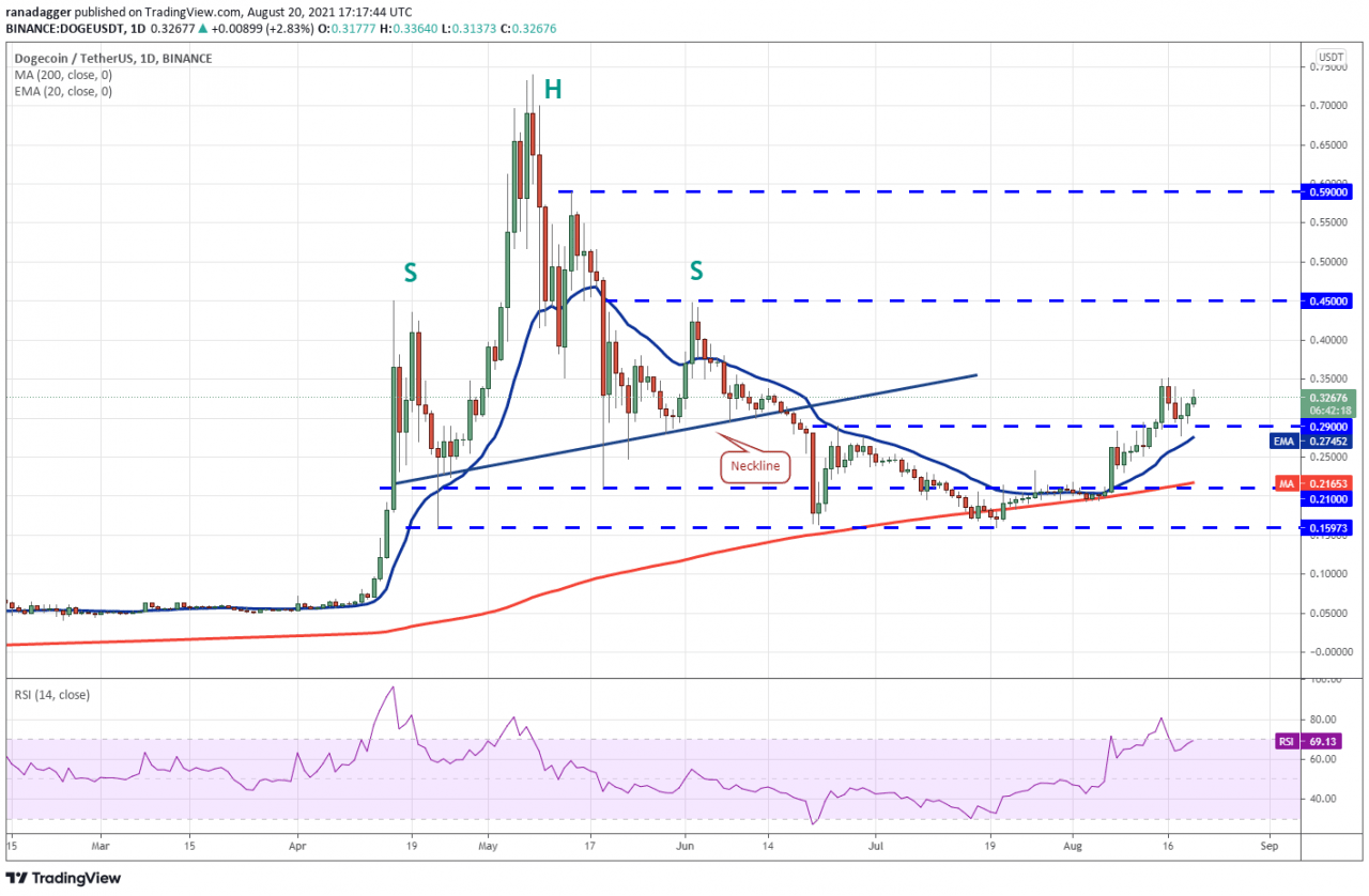 多头在 8 月 21 日成功捍卫了 0.29 美元的突破水平,表明市场情绪是积极的。 如果买家将价格推高至 0.35 美元以上,DOGE/USDT 货币对可能会反弹至下一个上方阻力位 0.45 美元。