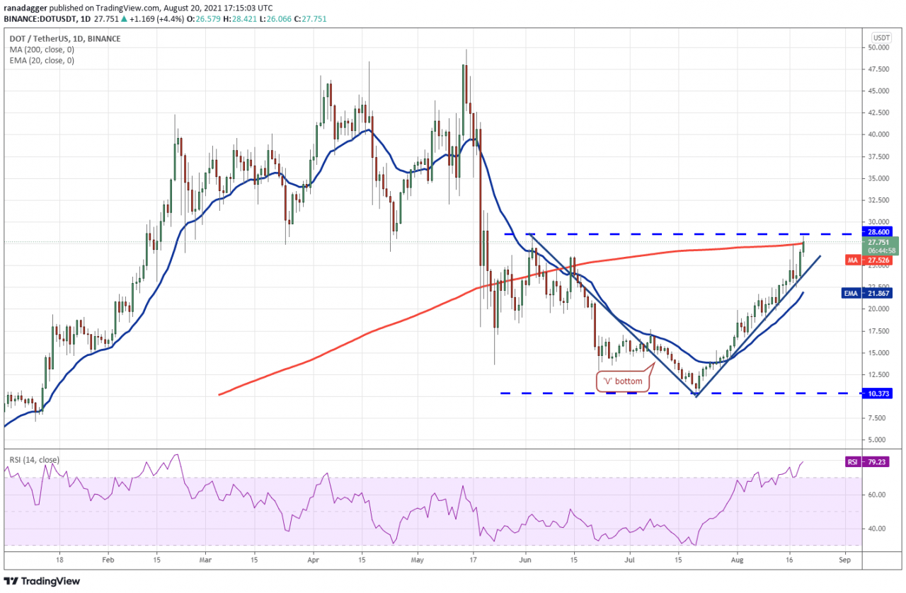 Polkadot(DOT)在 8 月 17 日从 200 天均线(27.52 美元)回落,但由于多头在 8 月 18 日逢低买入,因此修正是短暂的。买家今天将价格推高至 200 日均线上方.